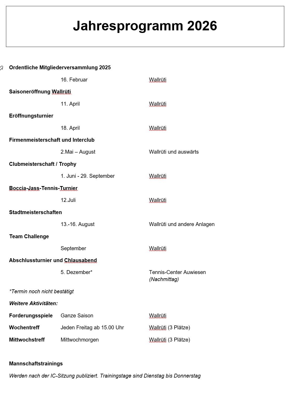 Hier findet ihr einen Ueberblick unserer Veranstaltungen in der Saison 2026. Einige Aktivitäten sind erst provisorisch und werden noch bestätigt.Alle Termine sind auch im Menüpunkt Agenda ersichtlich.